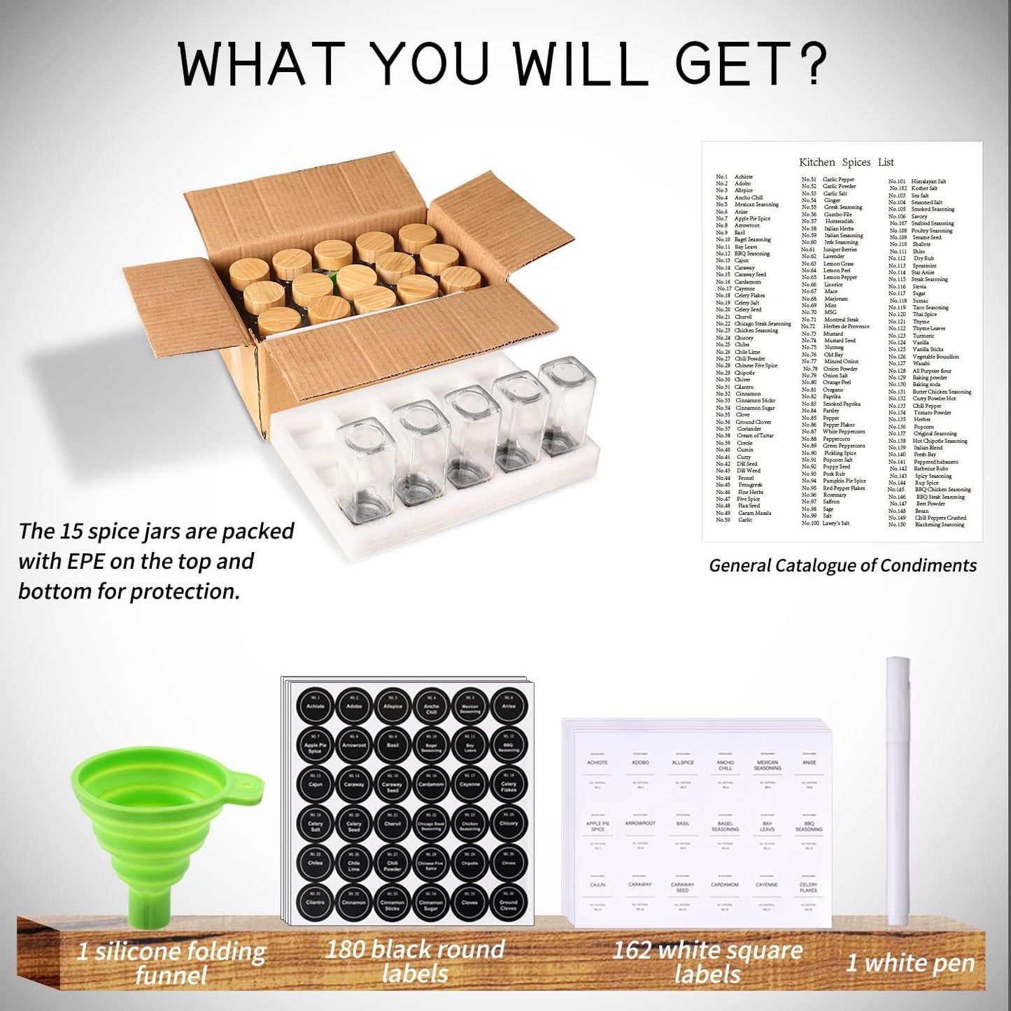 - This set includes 24 clear 4 oz glass spice jars with bamboo lids, a complete spice list, labels, a pen, and a funnel for easy refilling. Each jar features a double lid design: a bamboo outer lid to keep spices fresh and a shaker inner lid for convenient use. The variety of labels helps you organize your spices neatly, making your kitchen tidy and efficient.